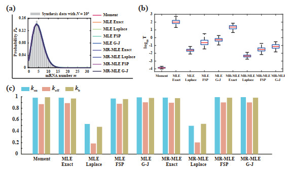 • Accurately estimating kinetic parameters of stochastic gene expression is a key challenge in quantitative single-cell transcriptomics. Building on the strengths of traditional methods, such as the method of moments and maximum likelihood estimation (MLE), we propose a novel framework: moment-reduced MLE (MR-MLE). We combined these three parameter estimation methods with four steady-state mRNA distribution computation strategies (exact distribution expression, Laplace approximation, finite state projection (FSP), and Gauss–Jacobi quadrature) to form nine distinct inference methods. These methods were systematically compared on both synthetic and real experimental data across two core dimensions: computational efficiency and parameter estimation accuracy. Results show that the Laplace approximation yields unreliable parameter estimates; the method of moments is computationally efficient but suffers from small-sample bias; the exact distribution solution is the least computationally efficient; and the FSP method exhibits fluctuating efficiency with varying gene expression levels. Notably, MR-MLE integrated with Gauss–Jacobi quadrature achieves the optimal balance between computational speed and inference robustness. Thus, we recommend this method as the preferred choice for fitting experimental data, providing a reliable and efficient computational solution for large-scale single-cell gene expression data analysis.